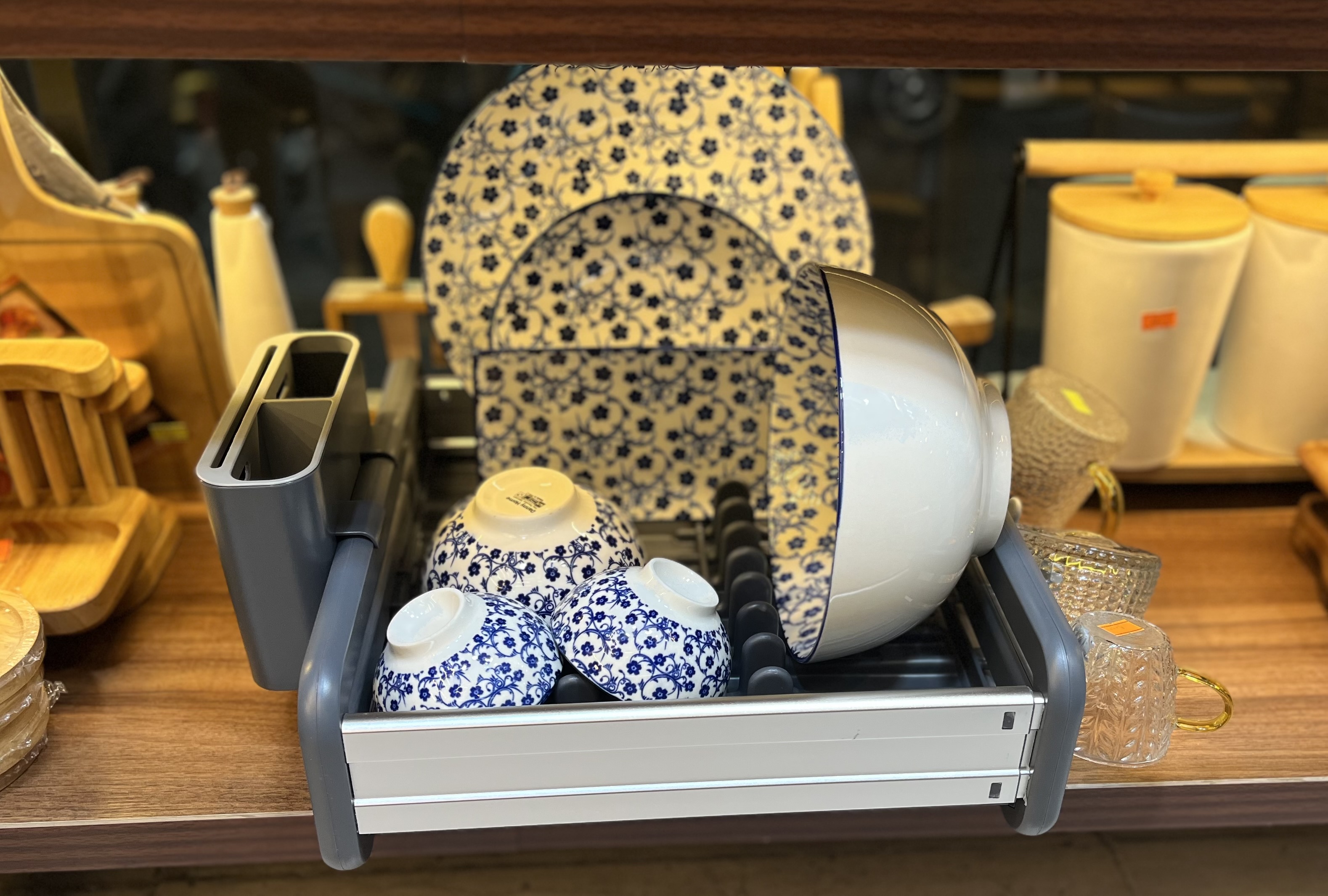 جا ظرفی کشویی باقابلیت تغییر سایز متریال المینیوم و پلاستیک ضد زنگ سبک و جا دار جاقاشقی کنار جاظرفی اویز لیوان کنار جاظرفی